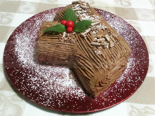 Polvilhe com o açúcar em pó, decore com raspas de chocolate e o azevinho.